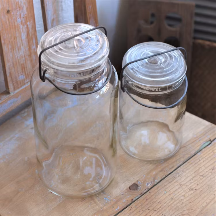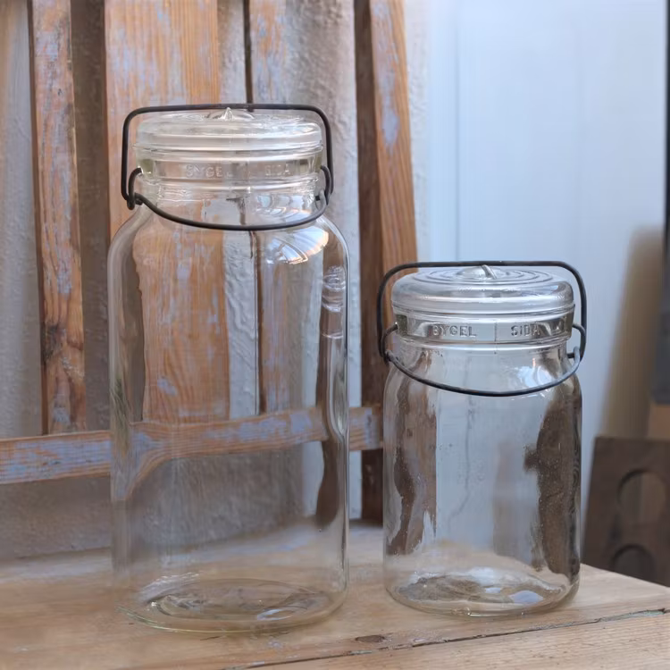 Glasburk med lock ca 24cm hög, locket inräknat. Det är den större burken på bilderna. Dessa burkar är mycket praktiska till förvaring då det är enkelt att se vad som finns inuti. Förutom i köket kan dessa burkar vara fina som stilleben med vackra saker eller bara som de är, som vackra inredningsdetaljer. Ett tips för att göra något lit extra skoj med dem är att stoppa ner en ljusslinga i burken och den ha som mysbelysning.