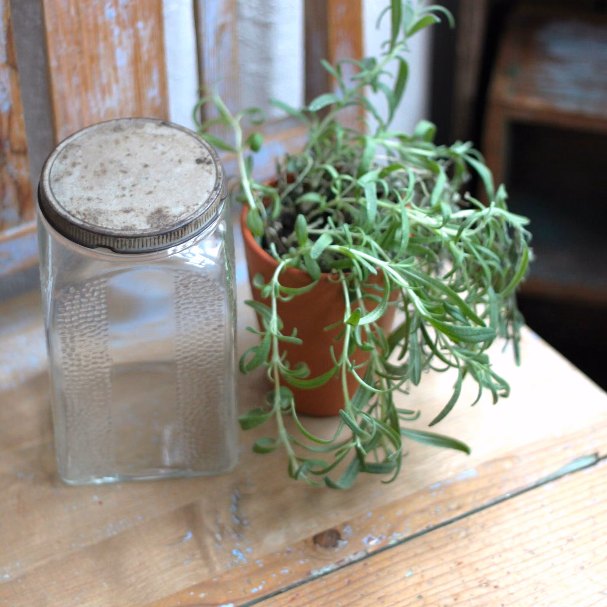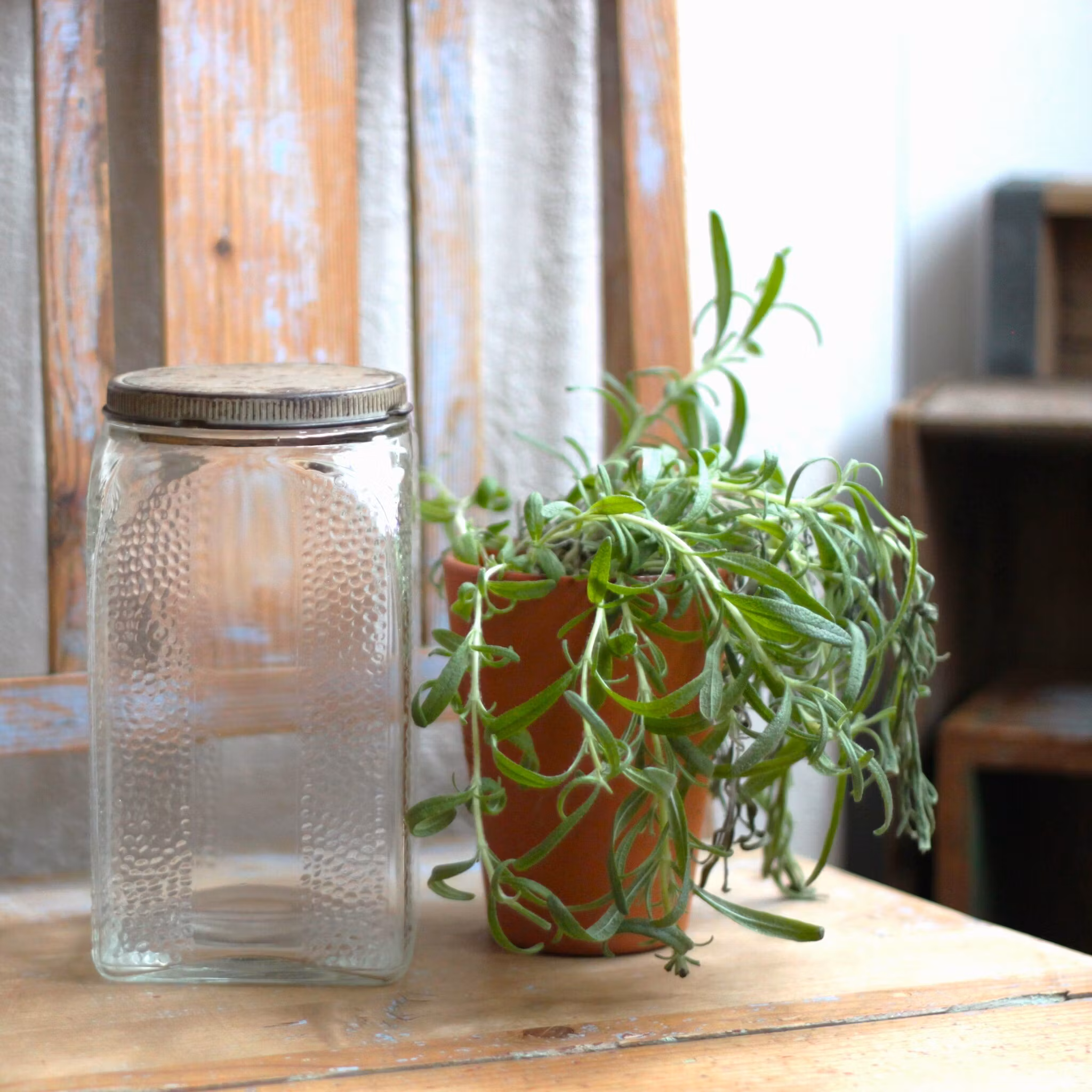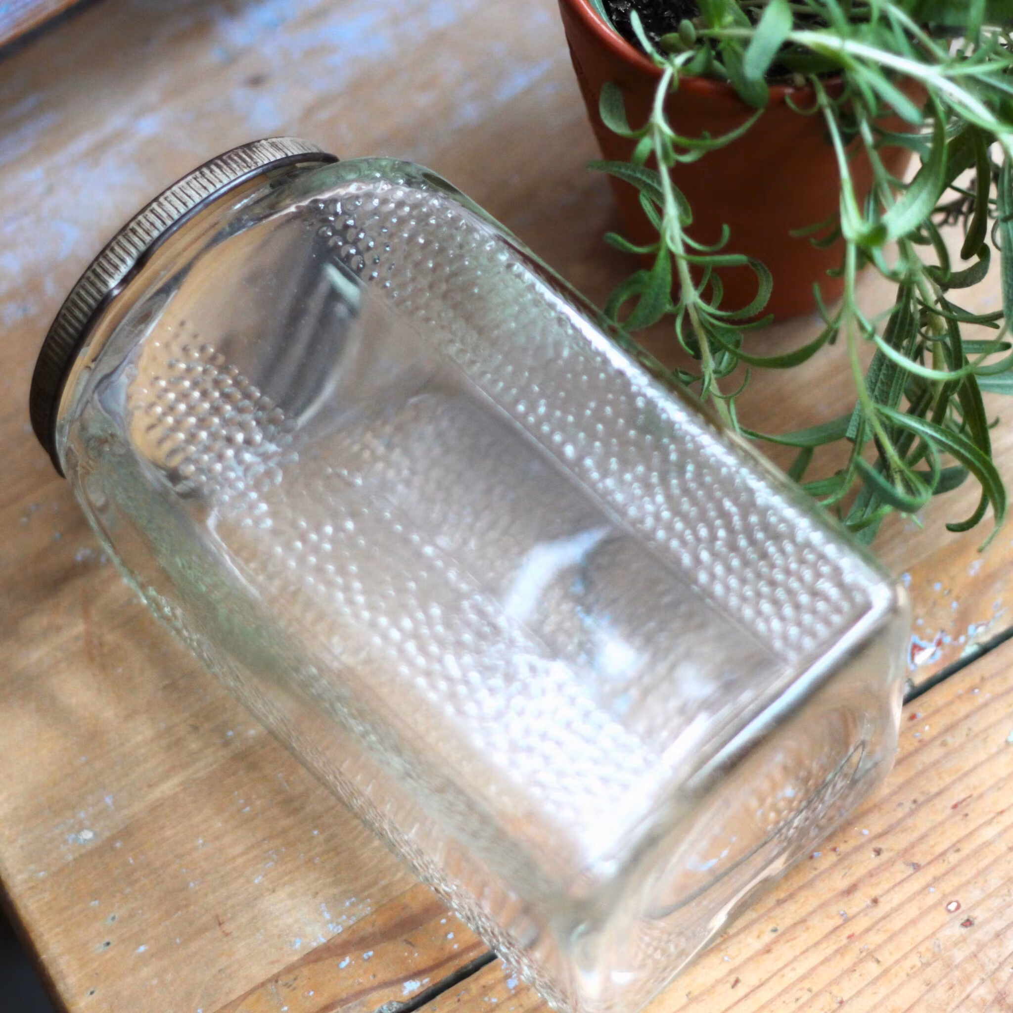Burk med dekor i glaset och skruvlock i metall. Burken är med lock ca. 18cm hög och sidorna är 9.5cm breda.
