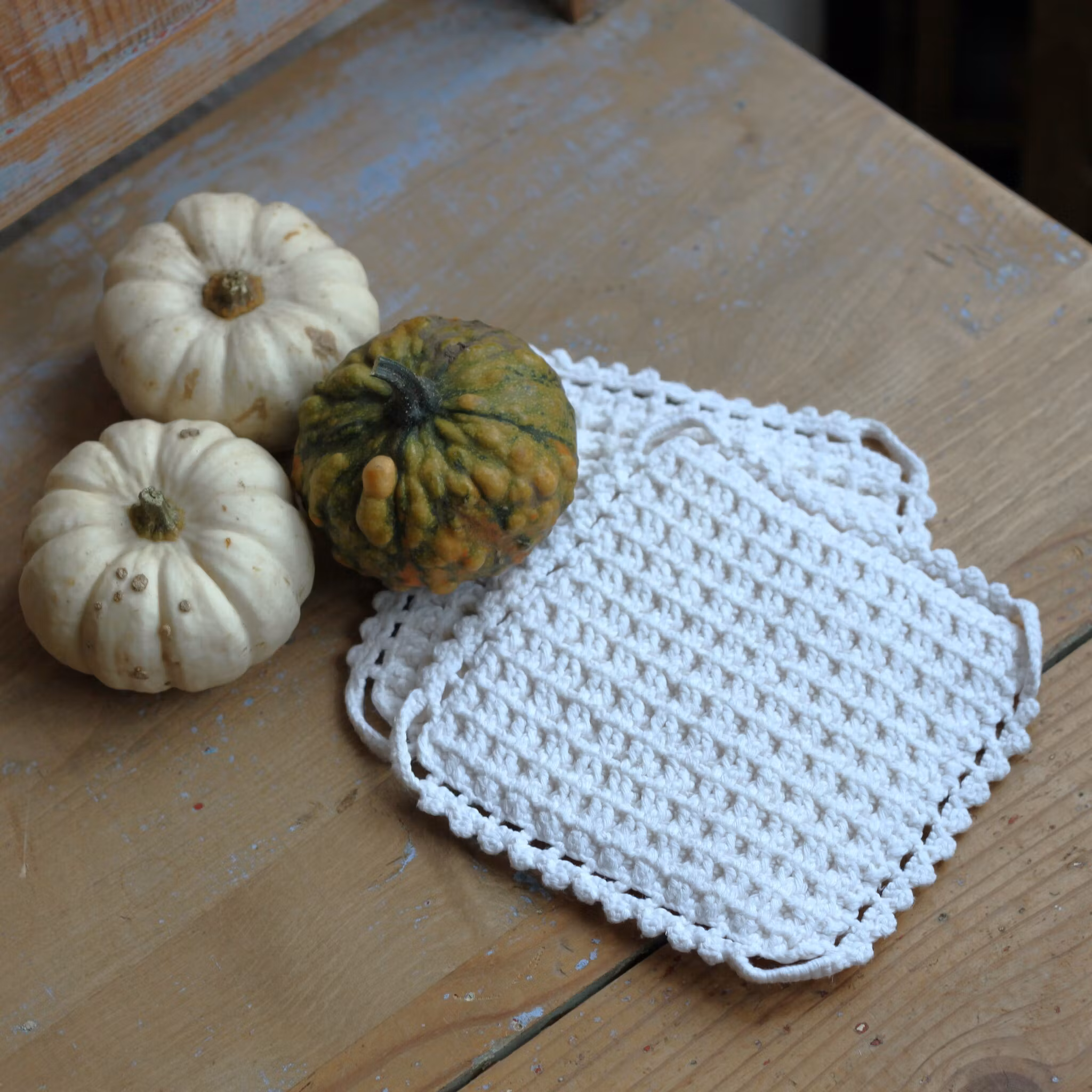 Grytlappar virkade i bomullsgarn, ungefär 12.5cm rakt över. Dekorativa att ha hängande framme och praktiska om en vill hålla eller lyfta något varmt.