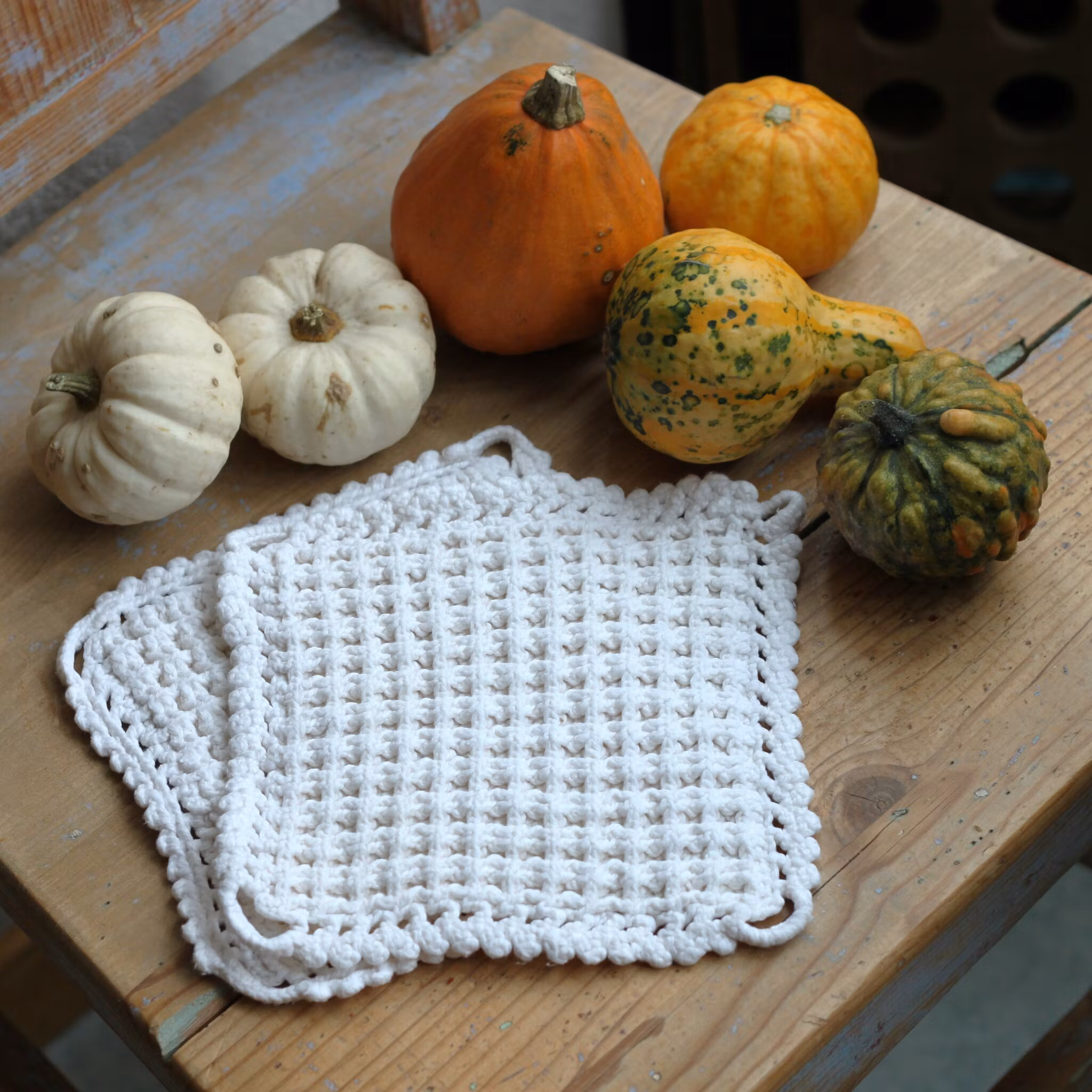 Grytlappar virkade i bomullsgarn, ungefär 16 x 1cm. Dekorativa att ha hängande framme och praktiska om en vill hålla eller lyfta något varmt.