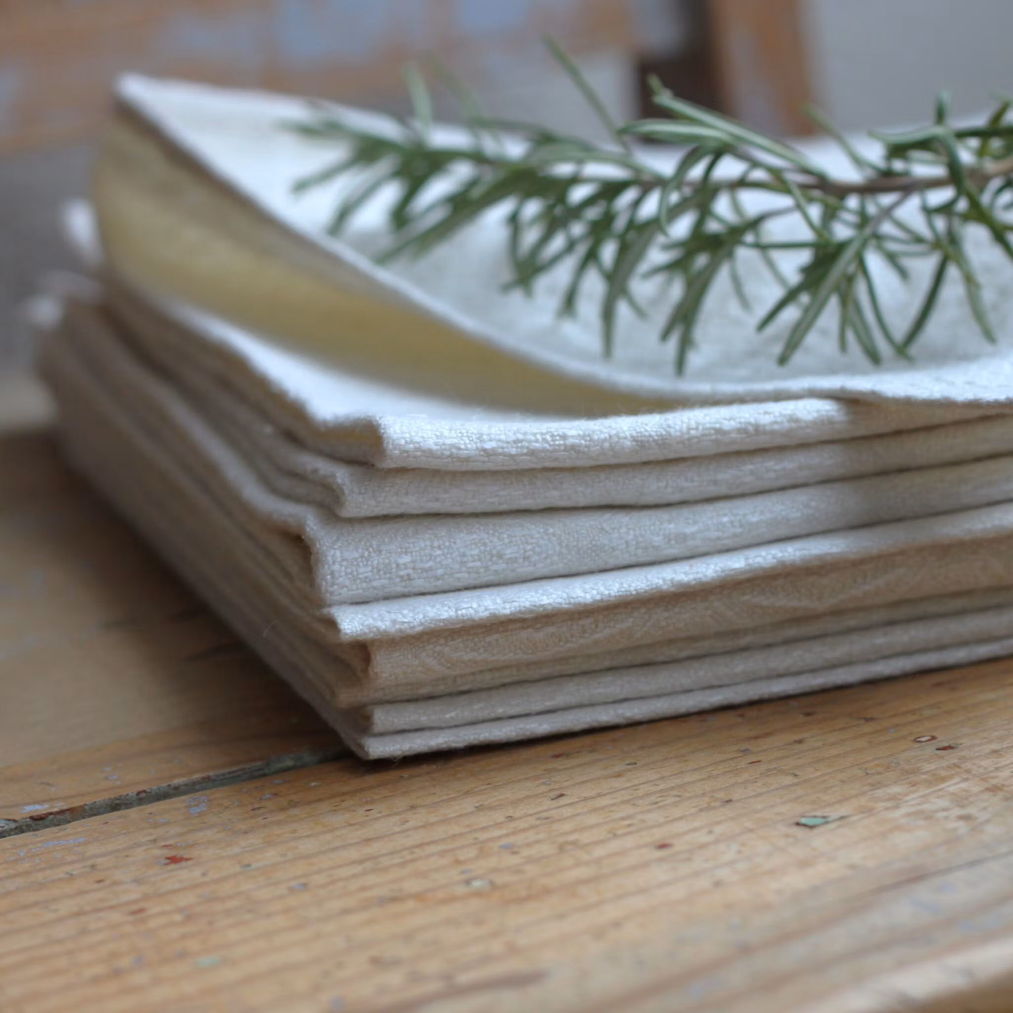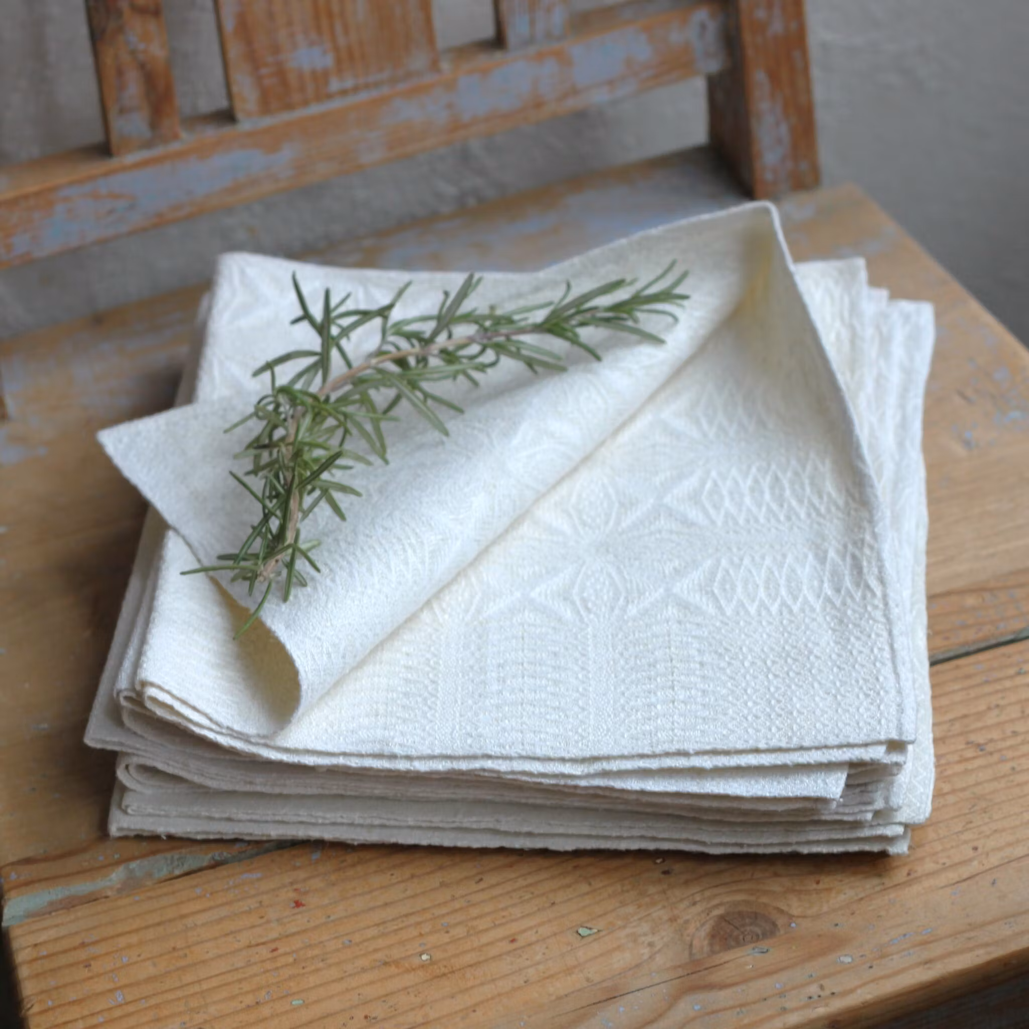 Vackra vita mönstervävda servetter i hellinne. Servetterna är tvättade och använda och har alltså redan krympts, mått ungefär 43x43centimeter.