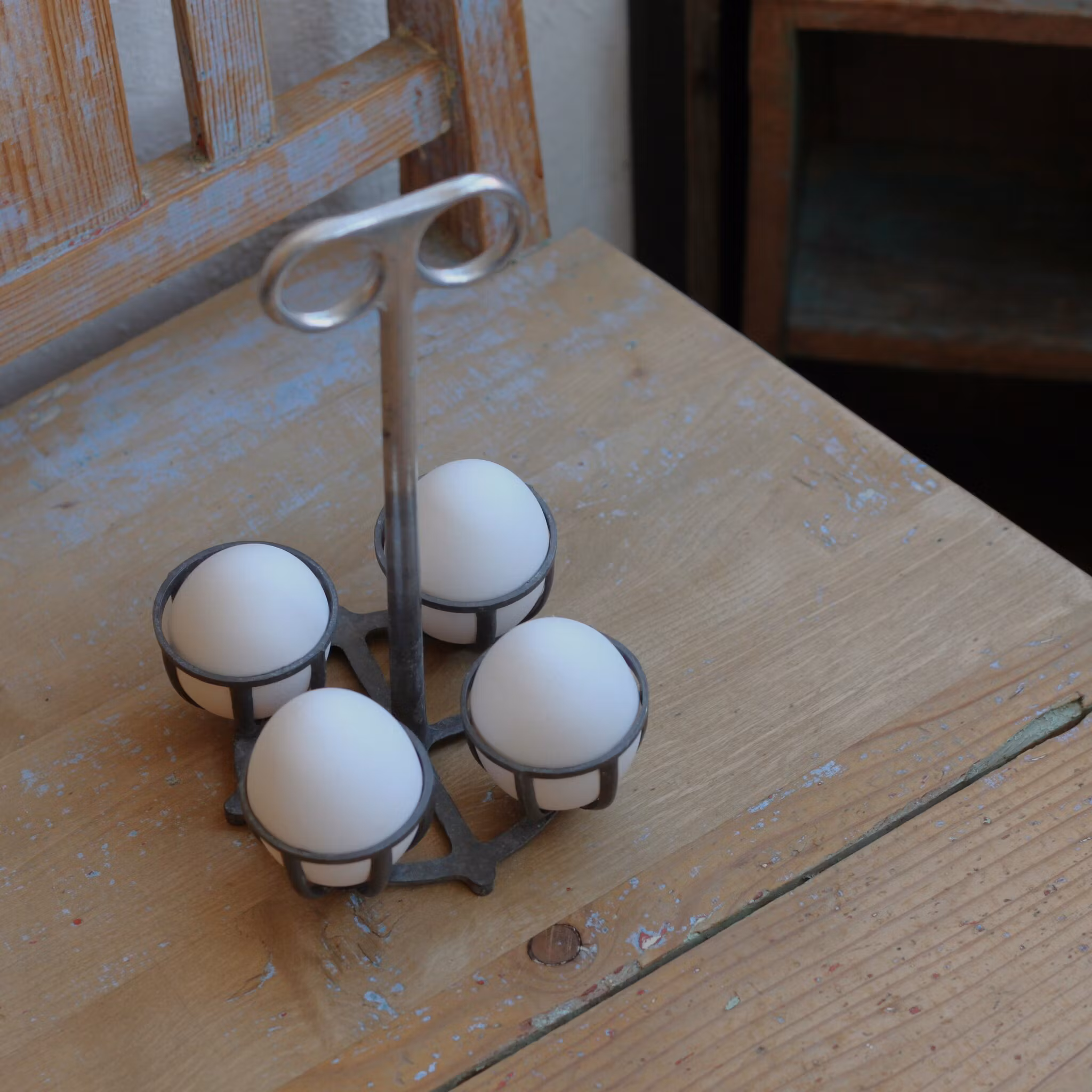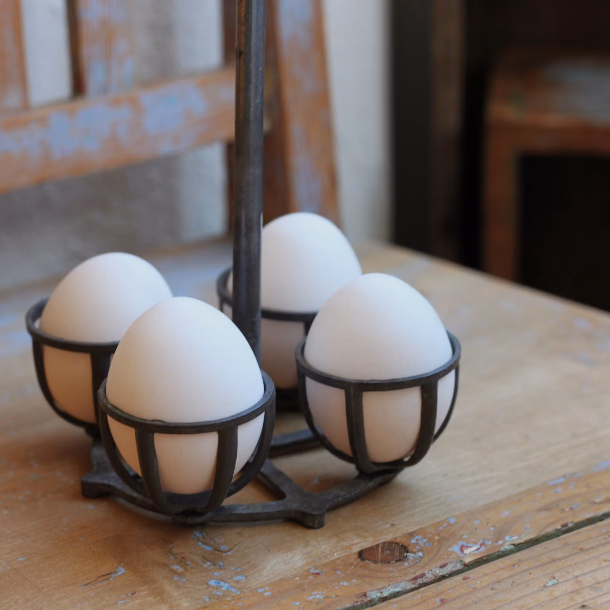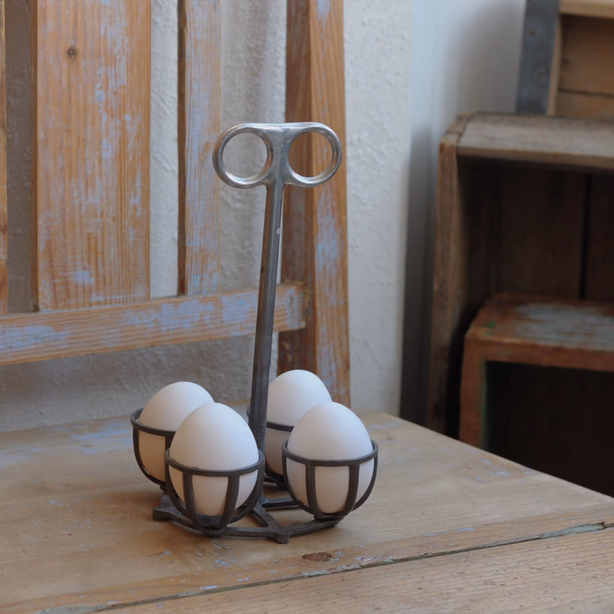 Äggställ för fyra ägg. Äggstället som är i metall kan sänkas ner i vatten med råa ägg, för att kokas, men det kan också ställas fram på bordet med ägg i och få vara dekorativt så. Stället är ca. 20cm högt.