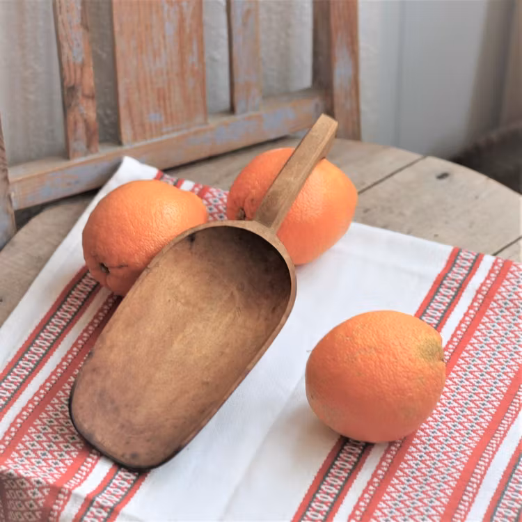 Lagom stor för både grötgrytan och att förvara en apelsin i, två apelsiner kanske funkar med, eller så lägger en klementiner i den istället, eller polkagrisar, å då får det plats många. Skopan är i trä och ca 28cm lång.