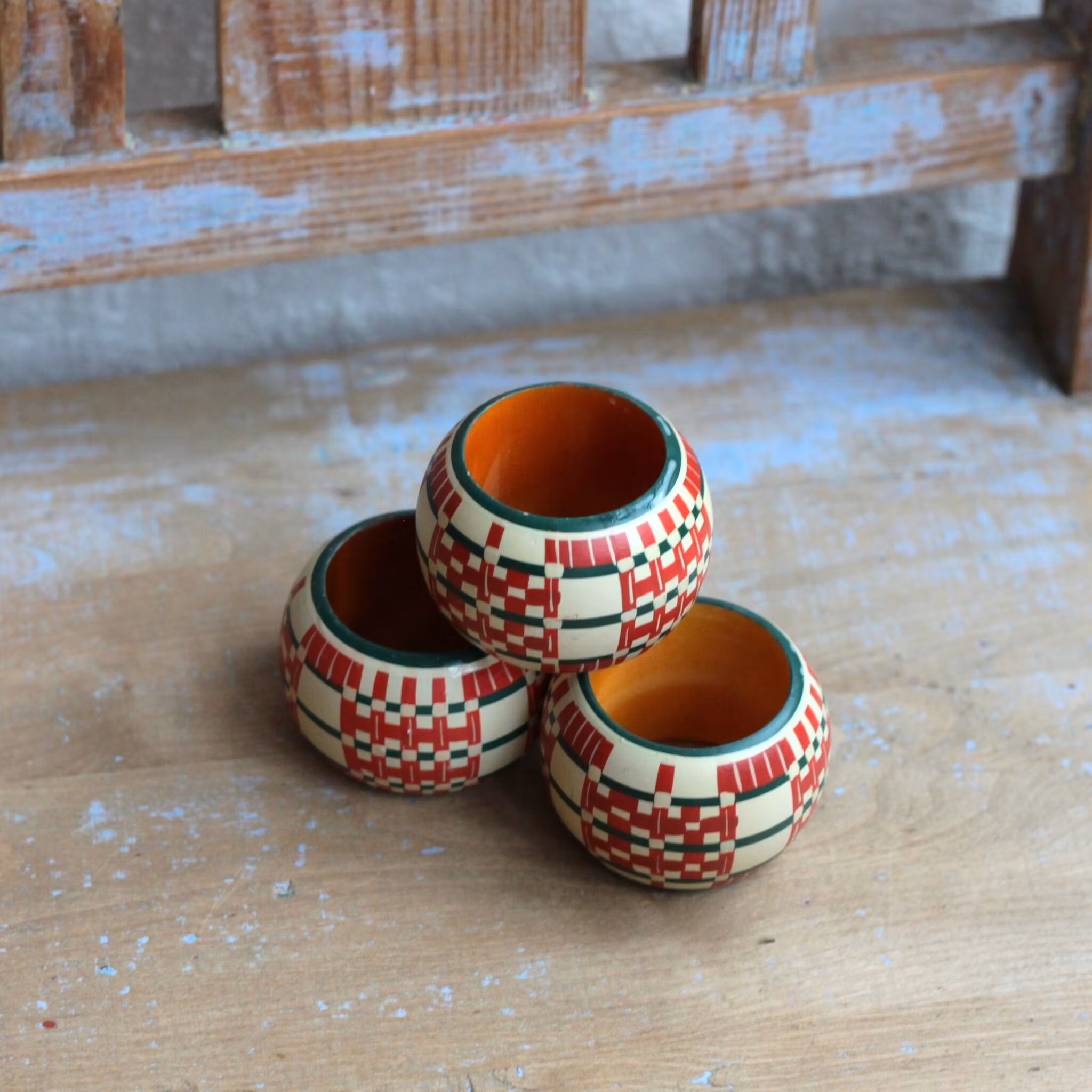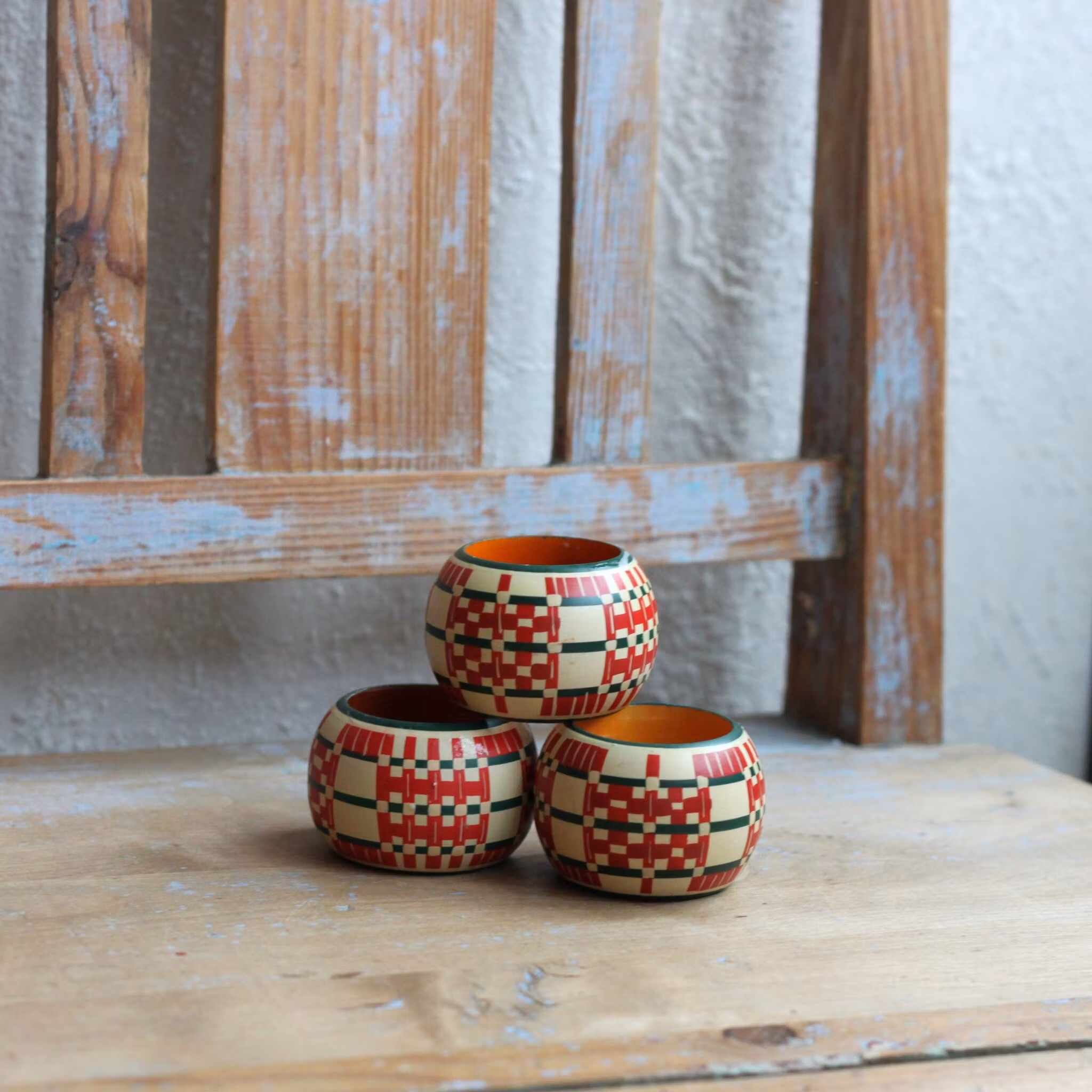 En uppsättning med tre runda servettringar i trä. Mönstret på dem är en variant av ett mönster som heter Munkabälte och är ett klassiskt svenskt mönster som gör sig fint både tillsammans med allmoge och i ett mer avskalat modernt hem. Dessa servettringar är lika fina i juldukningen som vid något annat tillfälle då linneservetter tas fram.