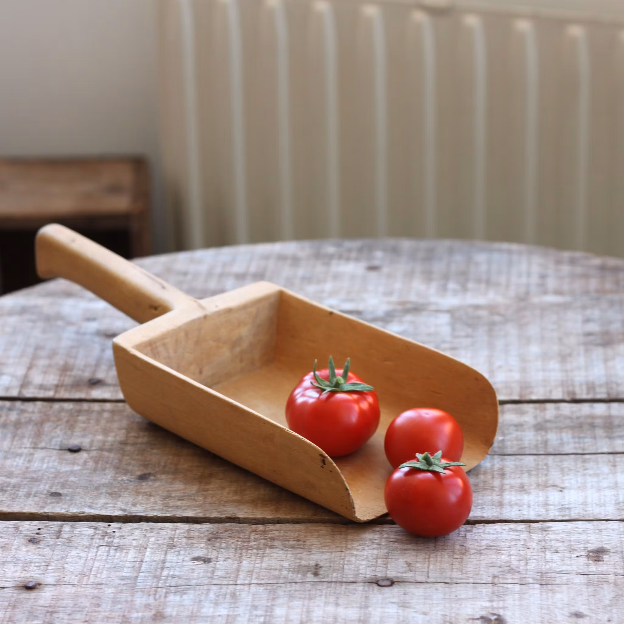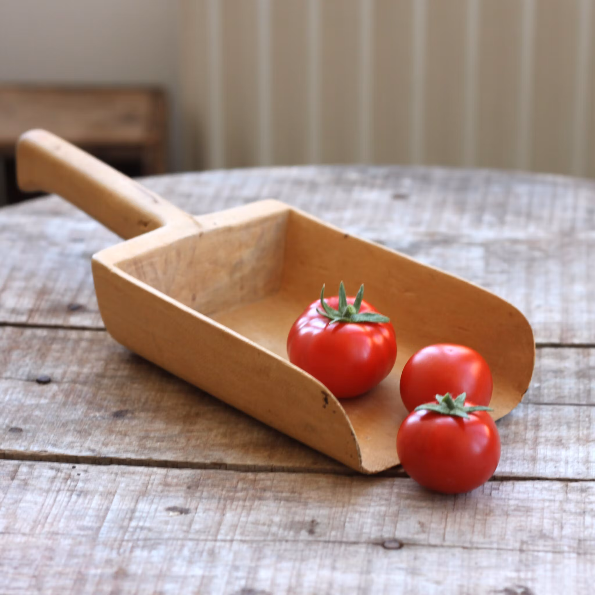 Skopa i trä lagom stor för exempelvis körsbärstomater. Skopan funkar fint att skopa allt från karameller till mjöl. Längd flr skaft och själva skopan tillsammans är ungefär 25cm.