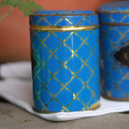 En liten blå plåtburk som det varit 1/4 kg karameller i . Burken är ca 9.5 cm hög inkl. lock. Burken är precis lagom hög att använda som Pennburk om man så önskar.