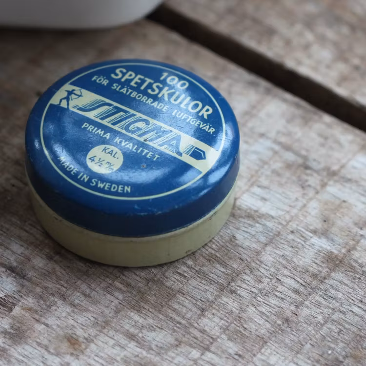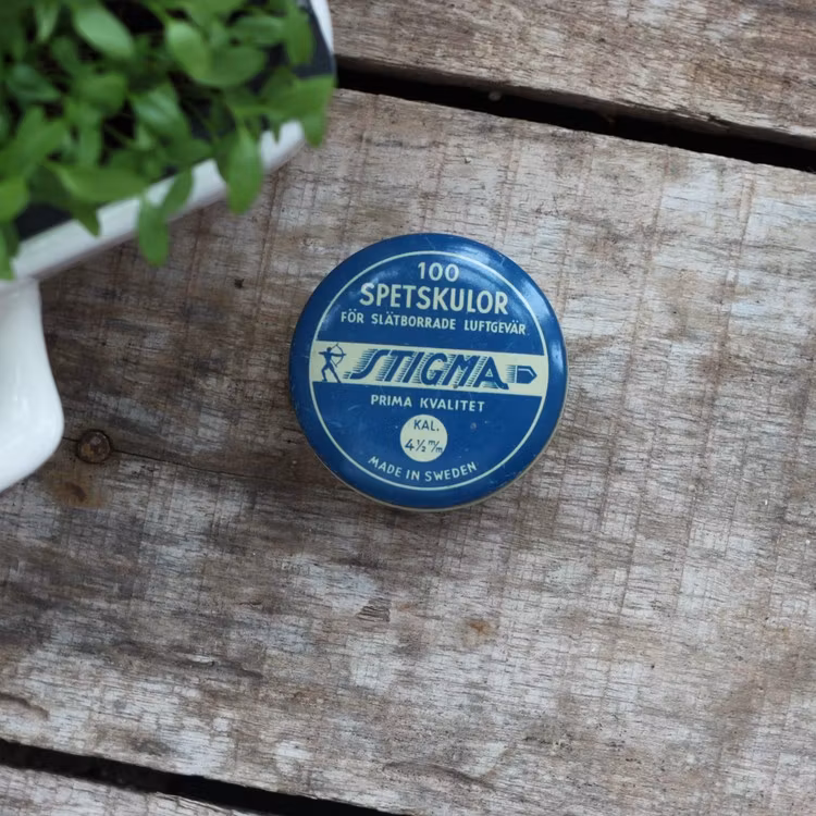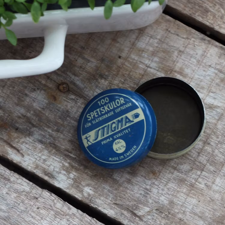 Liten fin burk som ursprungligen varit för luftgevärskulor men kanske kan få rymma en liten skatt nu istället. Man kan även välja att låta den vara fin och dekorativ utan något i också.