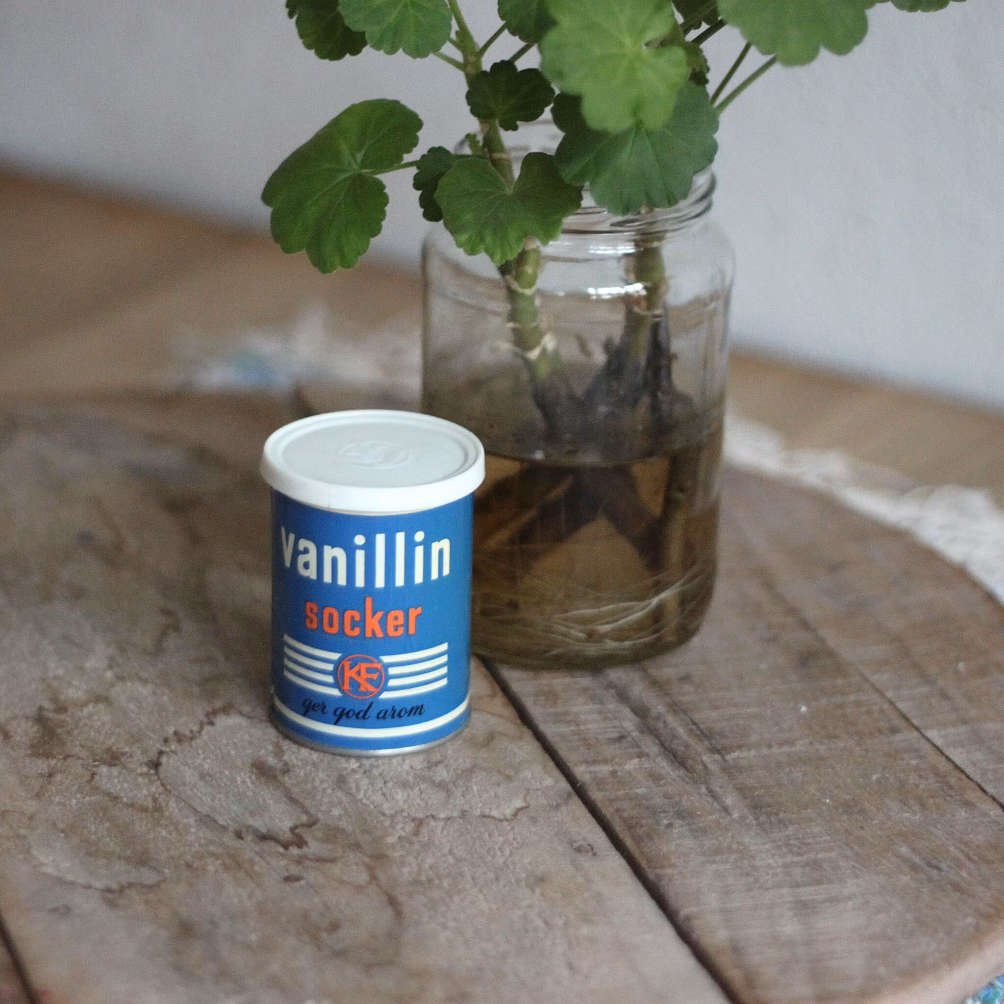 Söt liten rund burk i plåt, med plastlock. Denna lilla vanillinsockerburk är endast 7cm hög och väldigt fin.