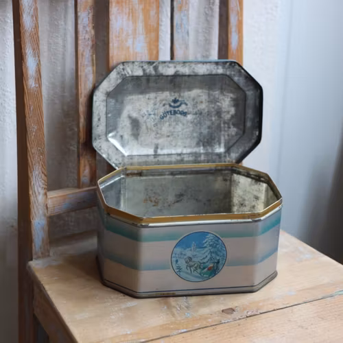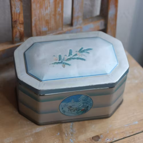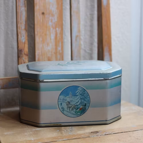 Med julmotiv på sidorna och grankvist på locket är detta en jättefin burk till Ischokladen eller kanske Knäck kan få bo i den. Burken är ungefär21 cm lång, 13.5cm bred och 10.5cm hög.