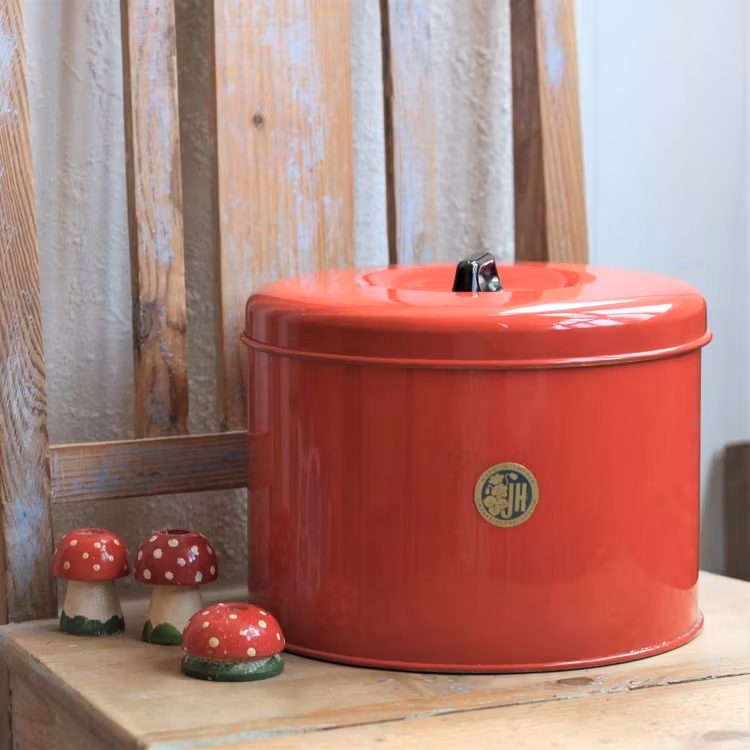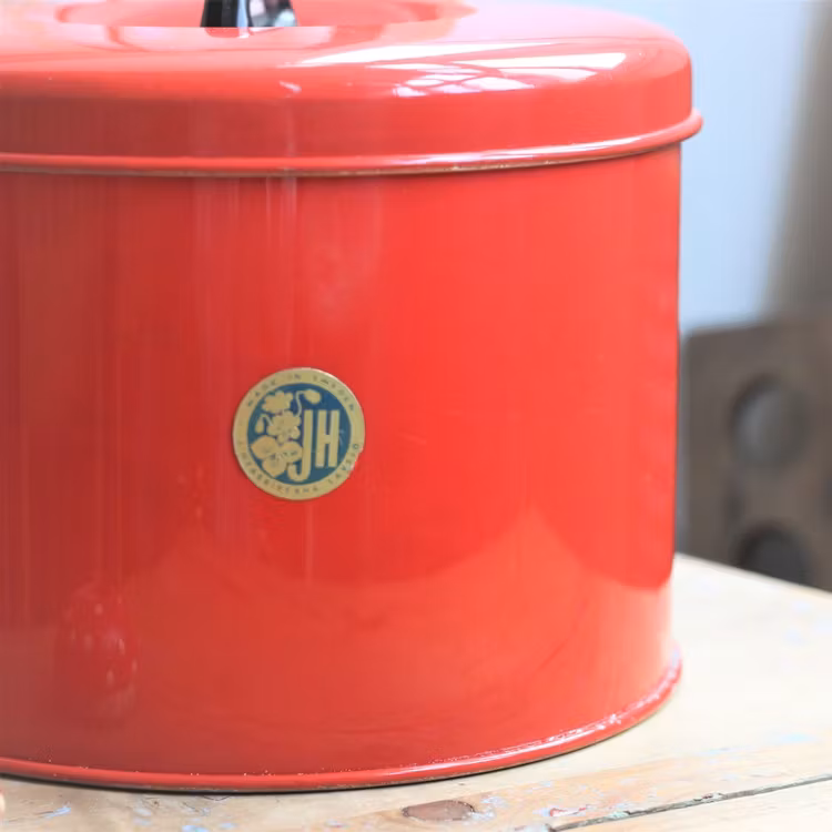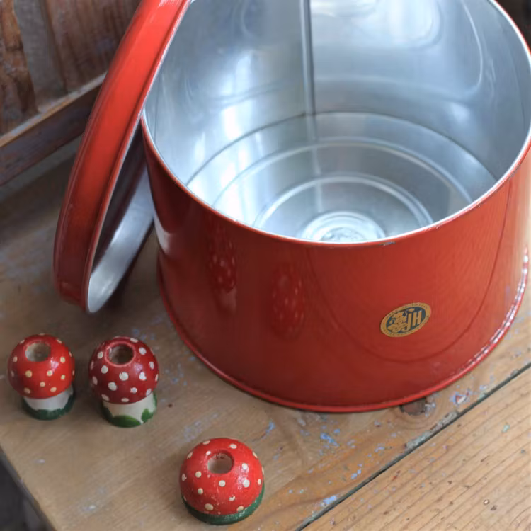 En lite större plåtburk i lätt aluminium. I denna får det plats många bullar eller kakor. Gillar man inte att baka så är runda burkar toppen att förvara sladdar i. Burken mäter ungefär 18.5cm rakt över och den är ca 13cm utan locket.