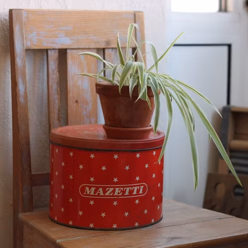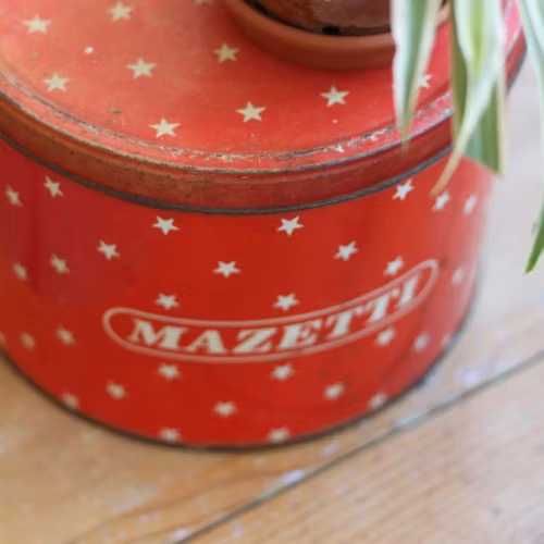 En riktigt stor burk med ett mått rakt över på ca 22cm och är 17cm hög. Häri ryms halva julbaket och på sommaren kan det bo en tomatplanta i den. Kom bara ihåg att ställa krukan i en plastpåse eller i en ha en kruka utan hål i botten, så att inte burken rostar inuti