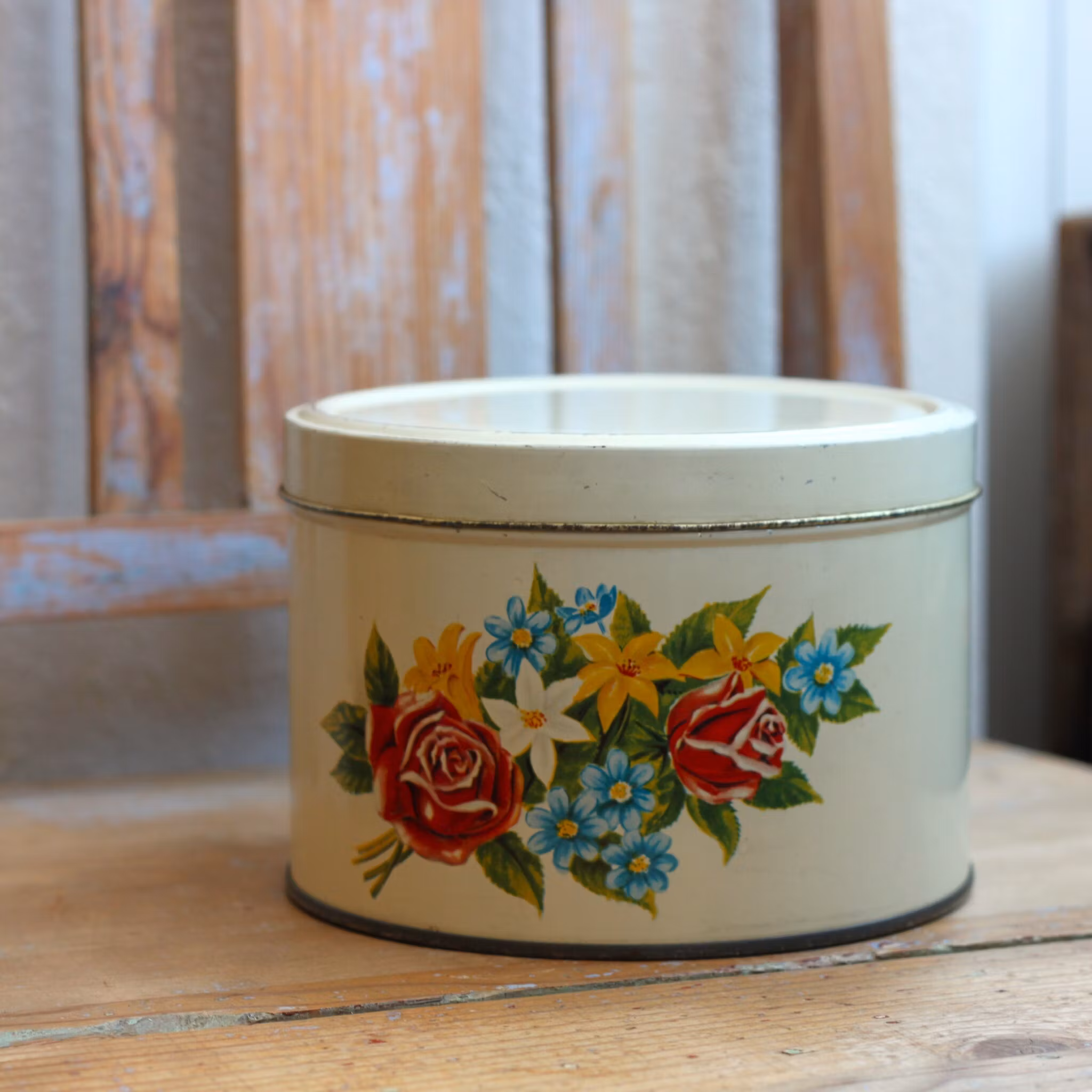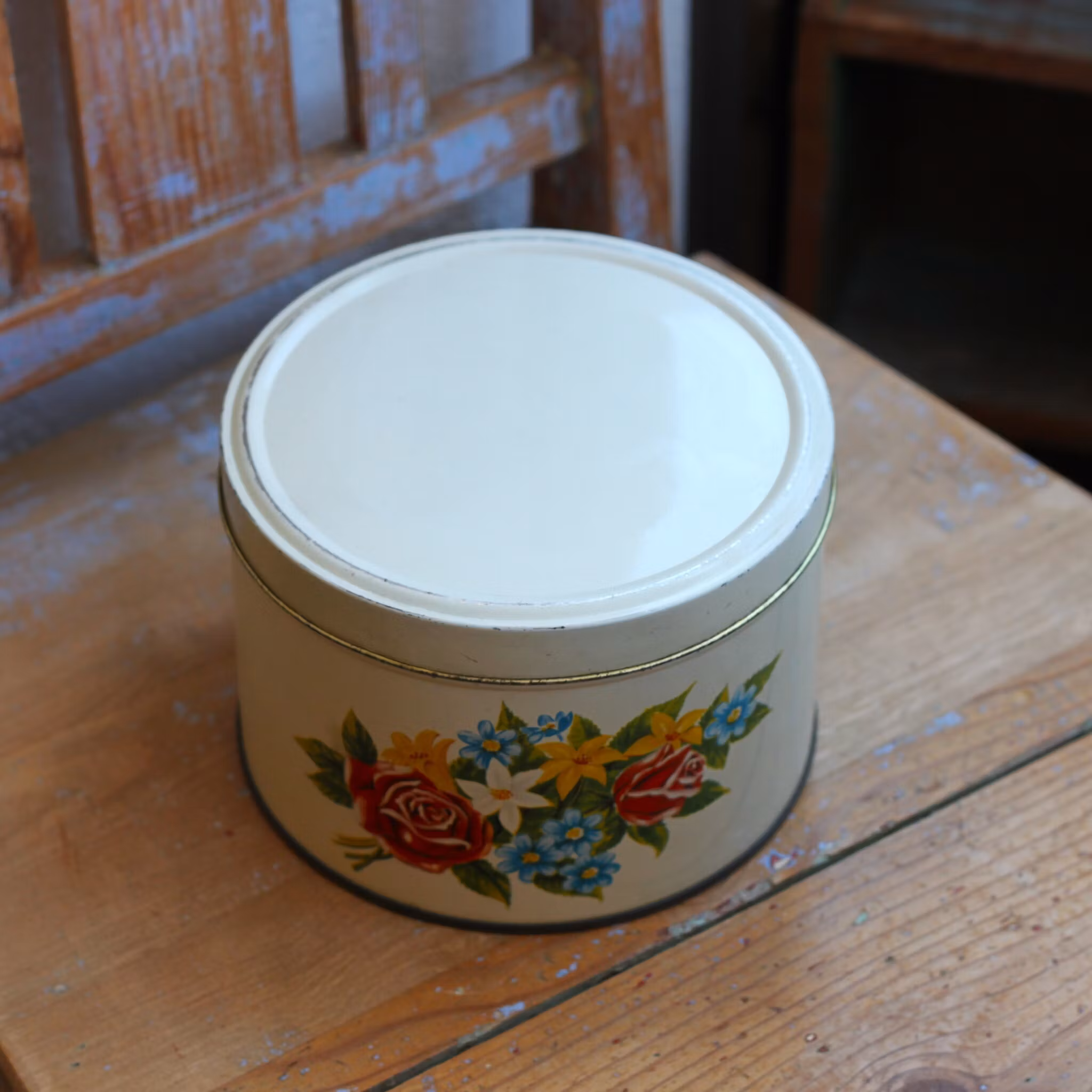 Rund, lite mindre plåtburk, vaniljgul med fint blommotiv som påminner om forna tiders bokmärken. Burken är 10.5cm hög inkl. lock och ca. 15.5cm rakt över.