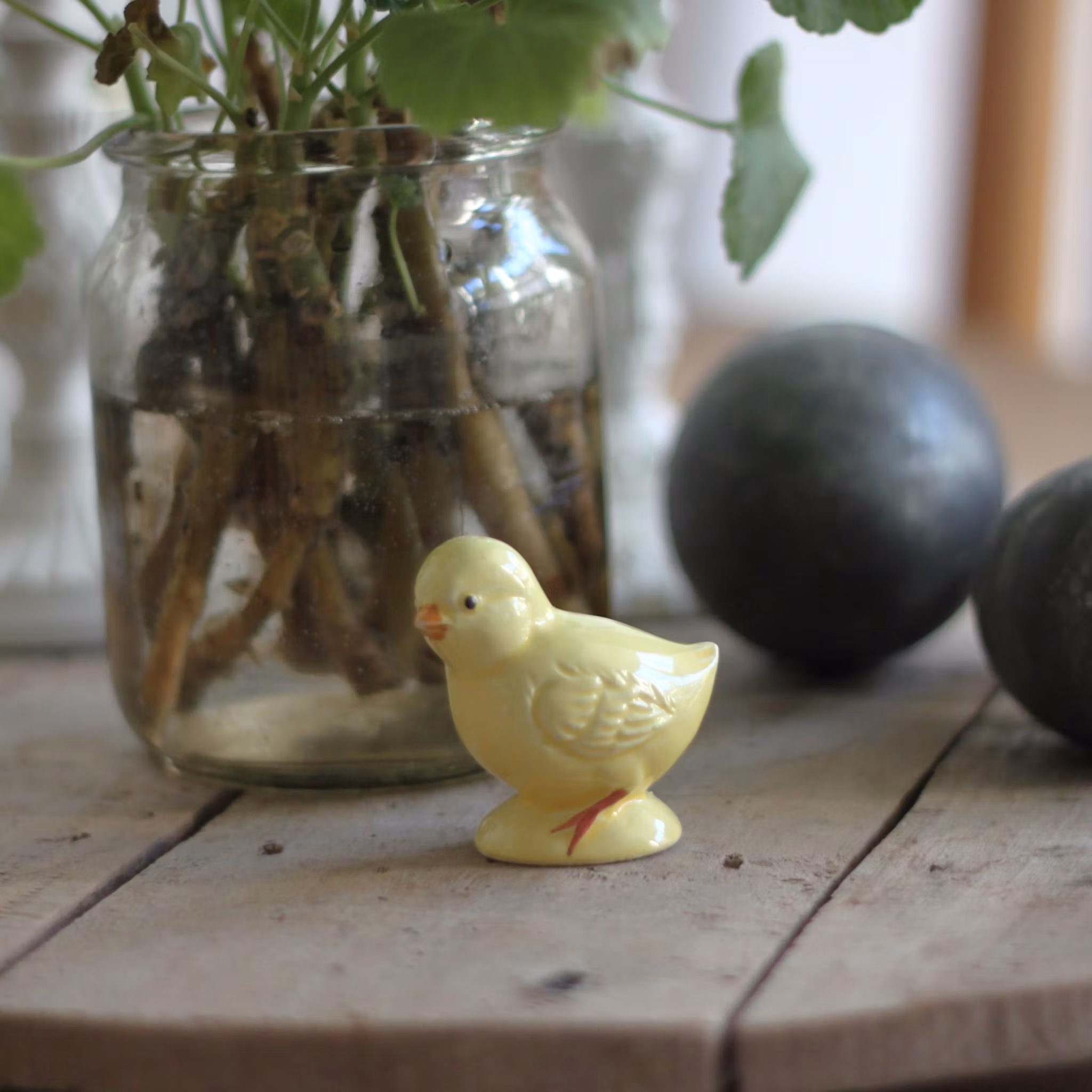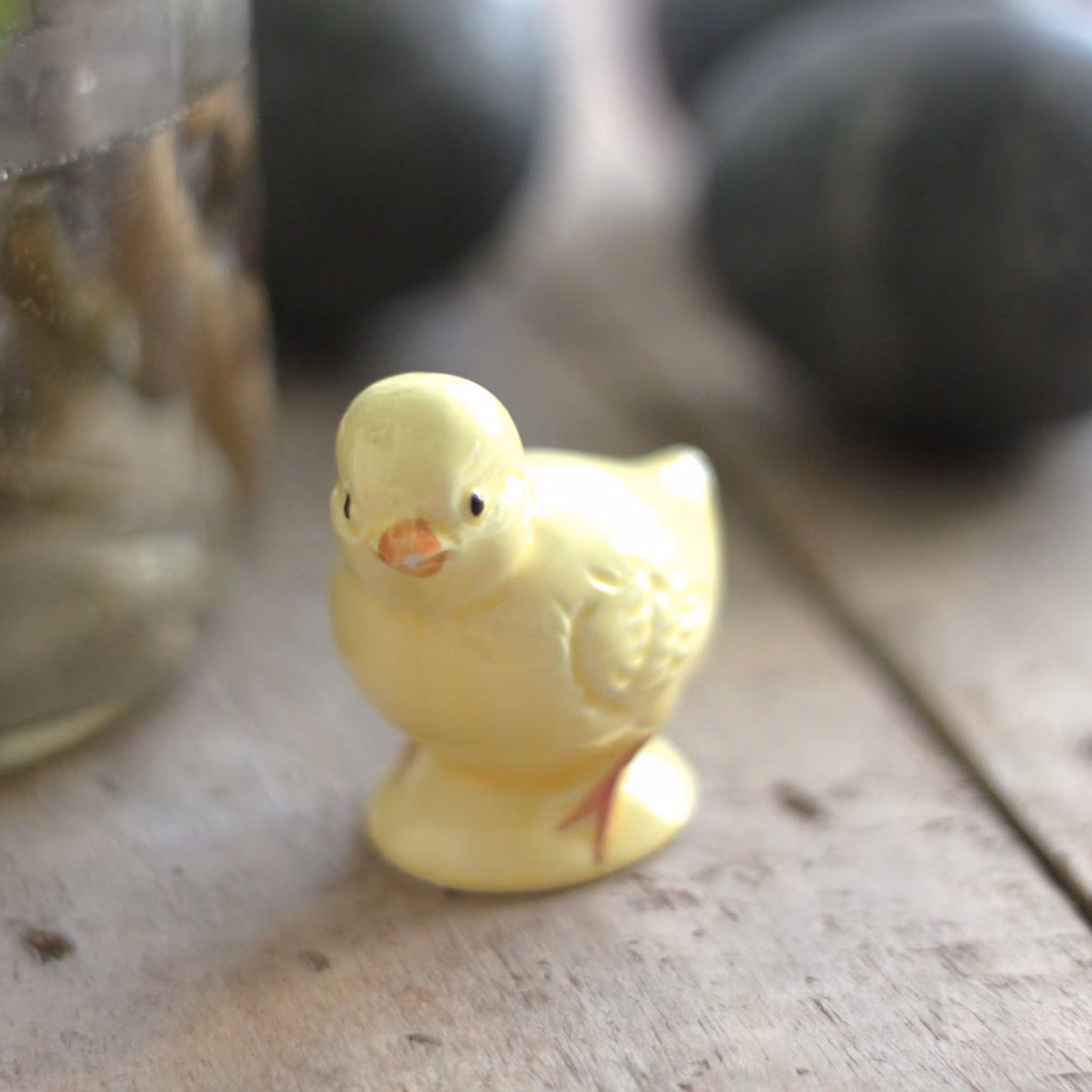 Liten gul kyckling, mycket fin. Kyckling är tillverkad i porslin som målats och den är endast 5 små centimetrar hög.