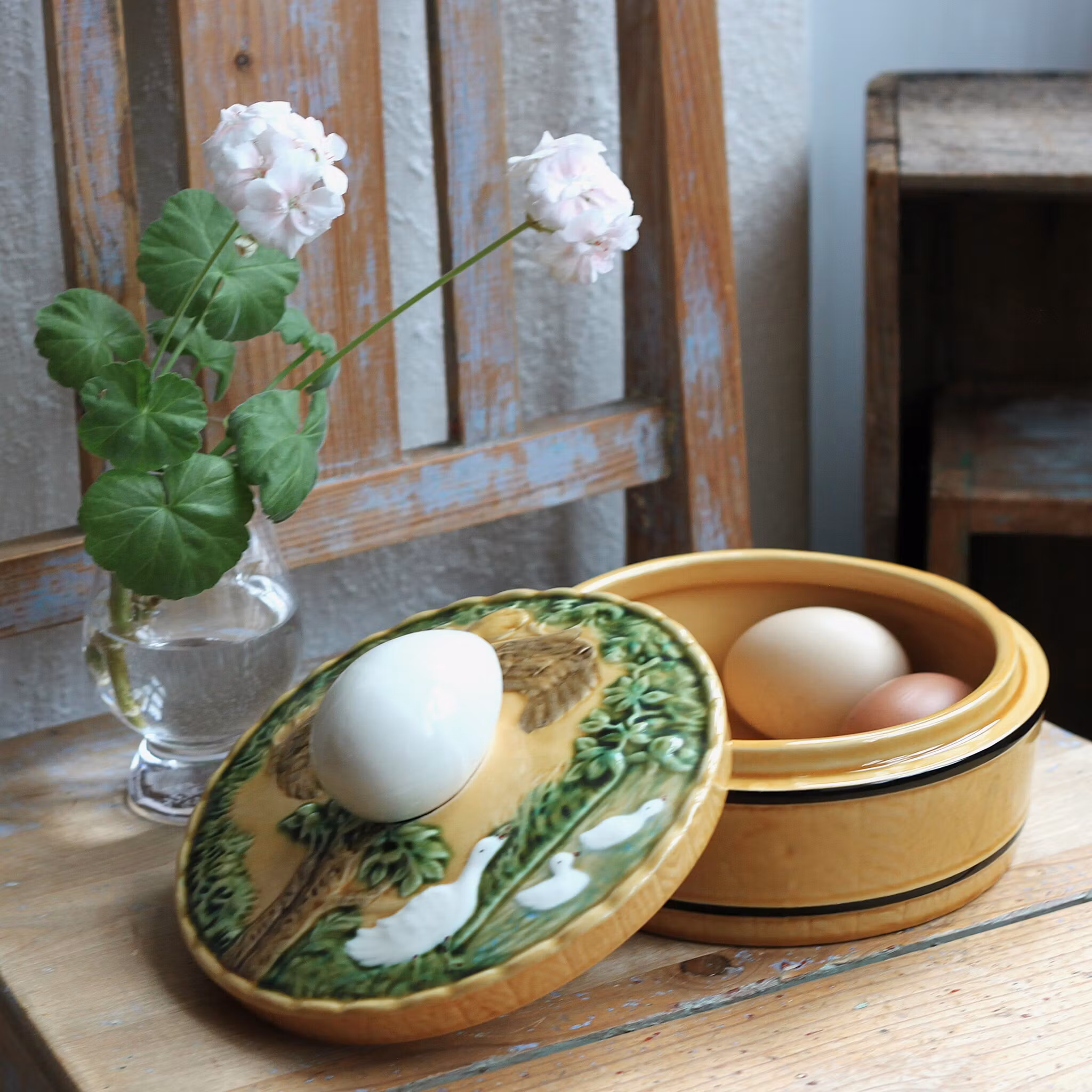 Denna ägg-gömma är lite udda. Ofta föreställer de hönor och äggen göms inuti men här är det en låg tunna och ägget ovanpå locket fungerar som handtag. Det finns en liten liten nagg i glasyren på locket, ägget är något större än ett vanligt hönsägg och tunnan är 16.5cm rakt över.